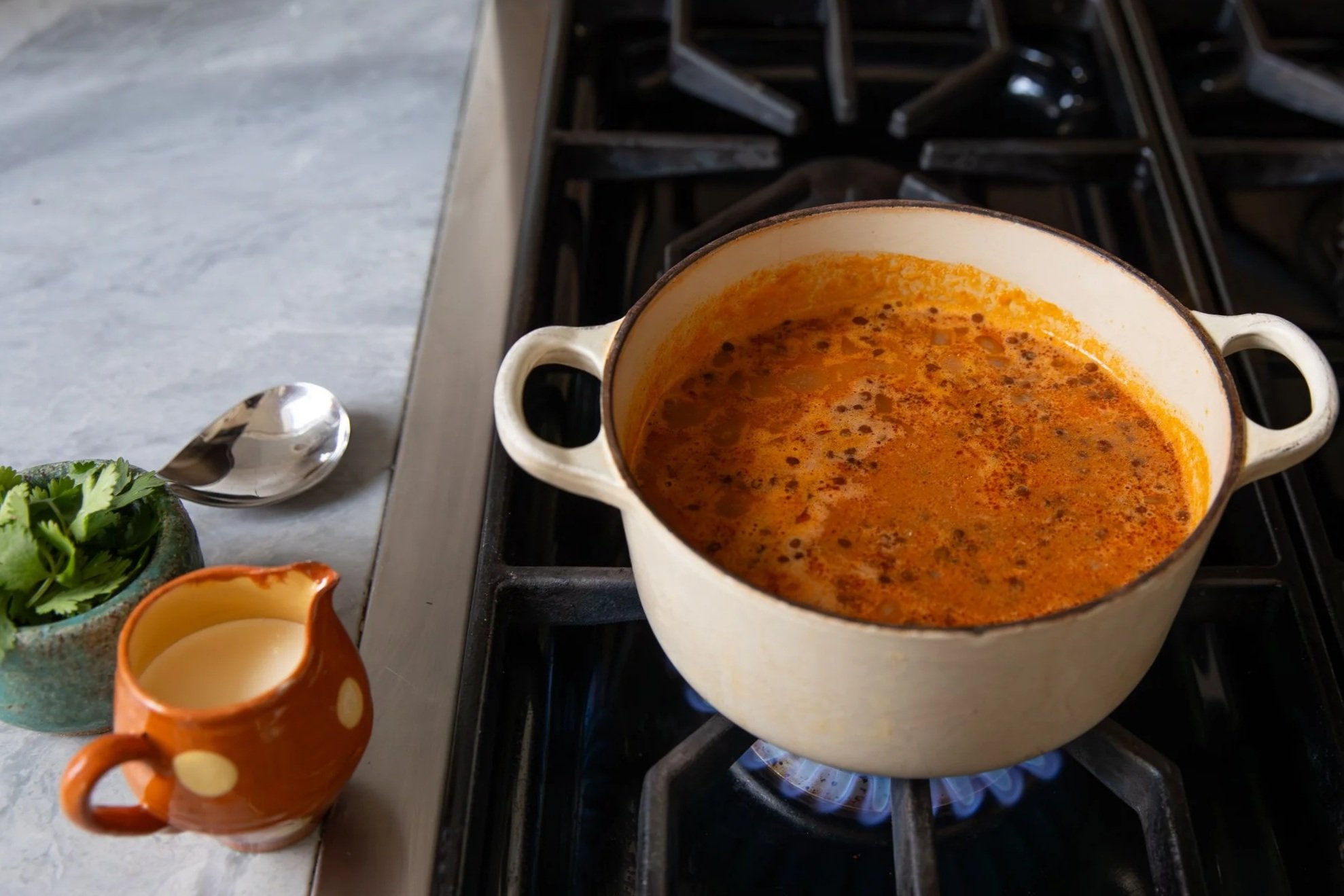 Put all ingredients except heavy cream and cilantro in a saucepan. Cover with water so ingredients are submerged under about an inch of water. Bring to a boil, then immediately lower to a gentle simmer. Partially cover the pot and stir every so often to blend ingredients. Cook for around 1 1/2 hour, or until flavors have come together and lentils are cooked through but are still firm. Taste and adjust seasoning, adding more salt if you wish, to bring out flavors. If the soup seems too thick at any point in the cooking, simply add a little water. Right before serving, finish it with some heavy cream—a few tablespoons or so. Serve with some fresh cilantro leaves and more cream to swirl in.